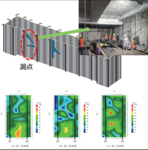 betway88集团应用具有自主知识产权的电阻率成像法,,,,在基坑开挖前,,,,可提前探明地连墙渗漏情形,,,,并举行注浆加固处置惩罚,,,,阻止基坑开挖历程中的渗漏对周边设施造成结构清静上的破损,,,,实现基坑清静治理关口前移,,,,现在已乐成应用于工民建和地铁项目,,,,准确率靠近100%。。